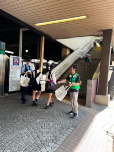 夏やすみも終わり学校生活が再開しました。四街道駅を利用する高校生を対象に、少年補導員として四街道警察の方と一緒に防犯チラシを配布。登下校にもいろいろな危険な状況が潜んでいるかもしれません。チラシを読んで少しでも危険な状況を避ける準備ができますように。楽しい学校生活を過ごしてください。