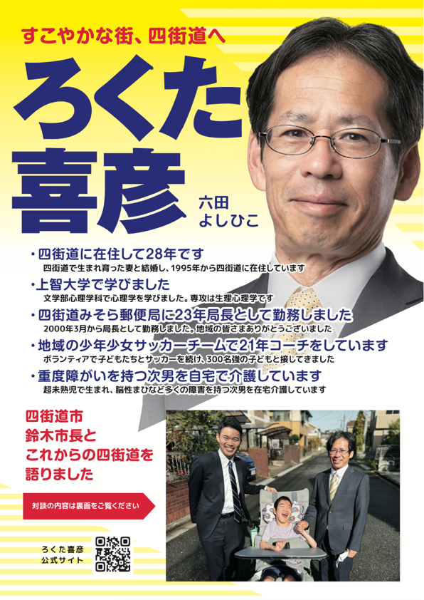 次男は1999年に8ヶ月未満での早産、出生児体重900グラム台の超未熟児で誕生しました。現在も経鼻管からの栄養摂取での自宅介護を続けています。障がい児や要介護者の家族での介護には限界があることを痛感しています。またサッカー指導の経験からスポーツ施設の充実、自らの闘病やスポーツ推進委員の経験からスポーツを通じた健康増進の重要性も感じています。