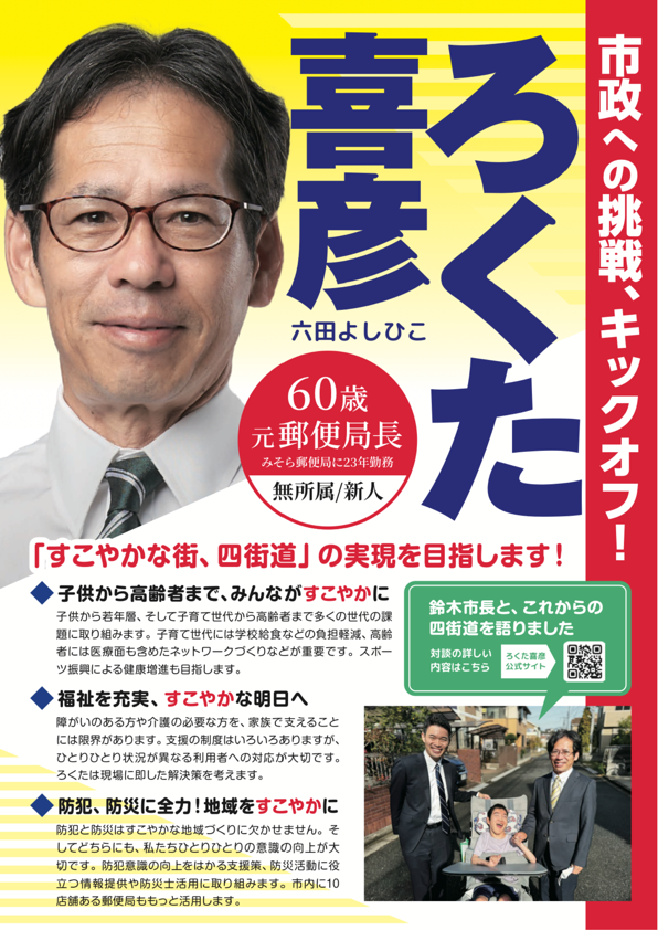 サッカー指導で接する子育て世代のお父さんお母さん、郵便局で接する高齢のお客さま。大きな不自由がなくても、もう少しの工夫や支援で、みんなが安心できる、もっと活気ある四街道に向かえるはずです。子育て世代の大きな課題は経済的な問題です。学校給食や子ども医療費などいくつもの課題があります。また高齢者が元気に過ごせるように医療面も含めたネットワーク構築に取り組みます